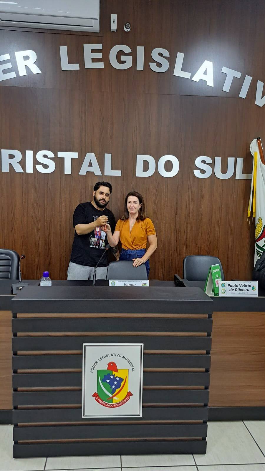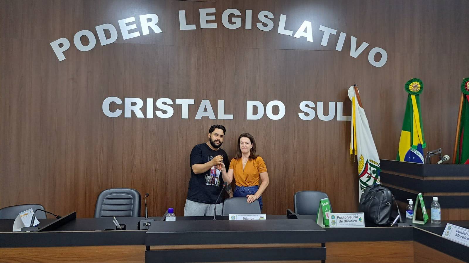 Na tarde da última terça-feira, 30 de dezembro, o então presidente da Câmara de Vereadores de Cristal do Sul, Vilmar Vicente, realizou oficialmente a transição do cargo de presidente para a nova presidente da Casa Legislativa, a vereadora Oneide Márcia Pelegrin.
